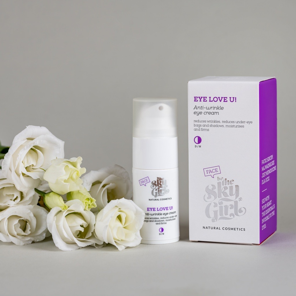 Skóra pod oczami i na powiekach jest dużo cieńsza niż na pozostałej części twarzy (ma tylko nieco ponad pół milimetra). Ponadto jest pozbawiona tkanki tłuszczowej. Przez to jest bardziej podatna na podrażnienia, utratę nawilżenia oraz pojawianie się zmarszczek mimicznych. Dodajmy do tego pielęgnacyjne grzechy, jak: niedokładne zmywanie makijażu, używanie płatków kosmetycznych i częste pocieranie skóry, zapominanie o filtrach UV, zbyt małe ilości wypijanej wody, niewielka ilość snu, można długo wymieniać. Niestety skutkują tym, że skóra pod oczami szybciej traci jędrność, elastyczność, osłabia się jej zdolność regeneracji i pojawiają się zmarszczki mimiczne. Dlatego tak ważna jest pielęgnacja prewencyjna. Jeśli jednak zmarszczki już się pojawiły, warto postawić na skuteczne preparaty o podwójnym działaniu. Widocznym gołym okiem kilka minut po aplikacji. Oraz regenerującym przy regularnym stosowaniu. Dokładnie tak działa nowość marki Be The Sky Girl – przeciwzmarszczkowy krem pod oczy Eye Love U!. W krótkim czasie wizualnie wygładza zmarszczki oraz podnosi odporność skóry na negatywne działanie czynników środowiskowych przy dłuższym stosowaniu.