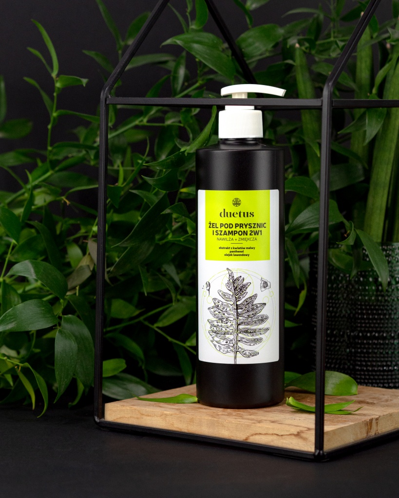 Kosmetyki przeznaczone dla dwojga DUETUS, szturmem zdobywają serca zarówno kobiet jak i mężczyzn. Przyjazne formuły, ziołowe zapachy i wyjątkowe połączenie oleju konopnego, czarnuszki, czy węgla aktywnego są skazane na sukces. Wśród tych kosmetyków do zadań specjalnych nie może zabraknąć produktów wielozadaniowych. Stanowią idealny sposób na ujarzmienie czasu, a jest to bezcenny dar, który możemy sobie ofiarować. Niezależnie czy pochłania nas pasja, praca czy dom, każda minuta jest na wagę złota. Do rodziny kosmetyków DUETUS dołączył żel pod prysznic i szampon 2w1 w dużym opakowaniu. Naturalny skład, wydajność (butelka 500 ml) oraz uniwersalna receptura sprawiają, że doskonale sprawdzi się zarówno do pielęgnacji ciała jak i włosów.