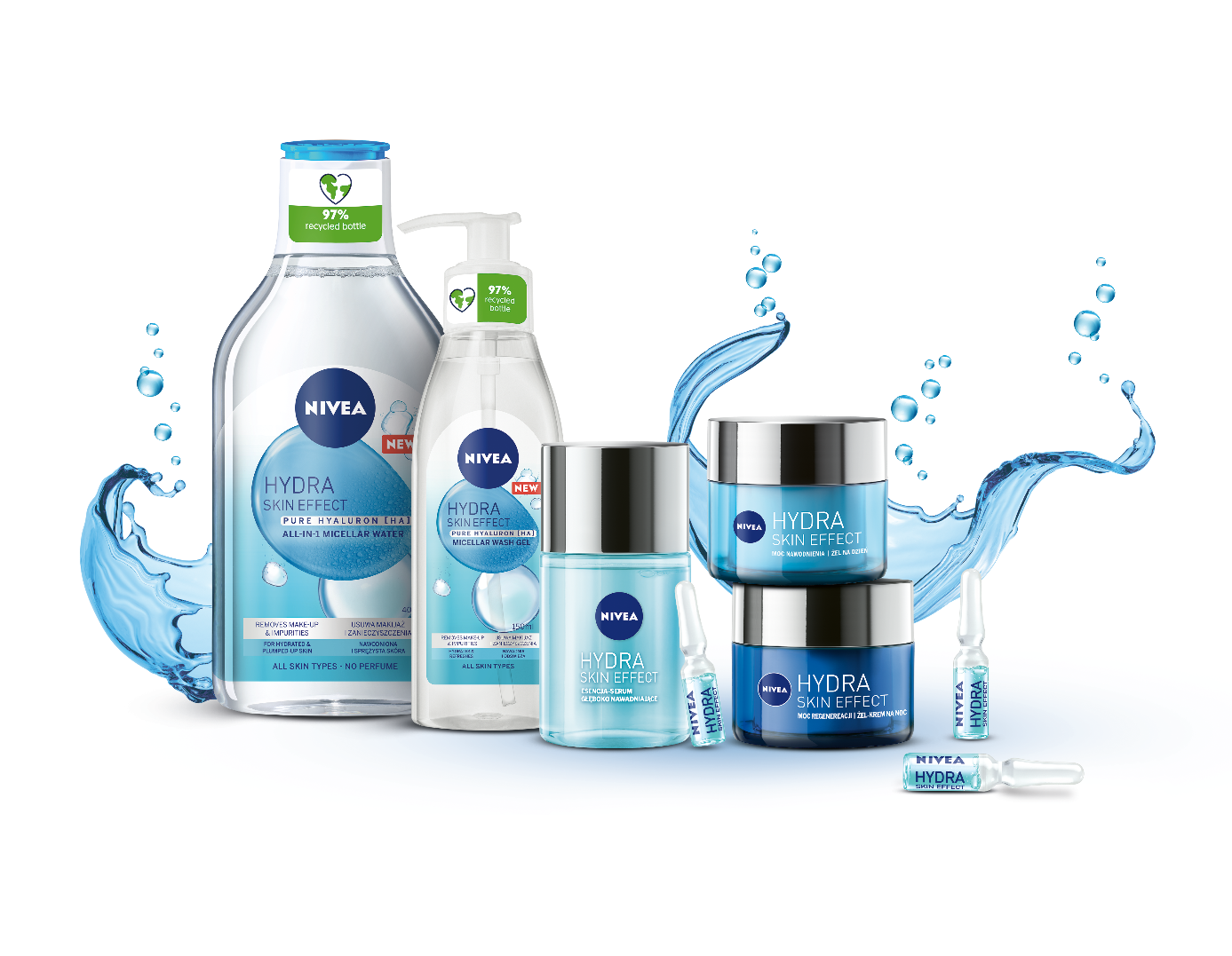 Innowacyjna formuła NIVEA Hydra Skin Effect wypełniona czystym kwasem hialuronowym [HA], nie tylko zapewnia intensywne nawilżenie skóry i widoczne wygładzenie, ale także aktywuje komórki skóry do 3-krotnie większej produkcji własnego kwasu hialuronowego.