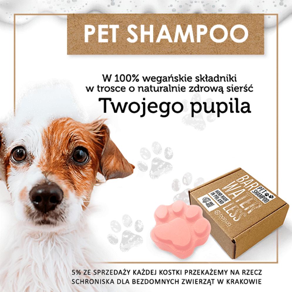 Pet Shampoo to wegański szampon, który jest wykonywany ręcznie na specjalne zamówienie klienta, który decyduje o rodzaju użytej glinki i zapachu kostki. Dodatkowo mają one uroczy kształt odbitej łapki. Składniki zawarte w szamponie zostały specjalnie wyselekcjonowane tak, by sierść została dokładnie oczyszczona, odżywiona i wypielęgnowana.