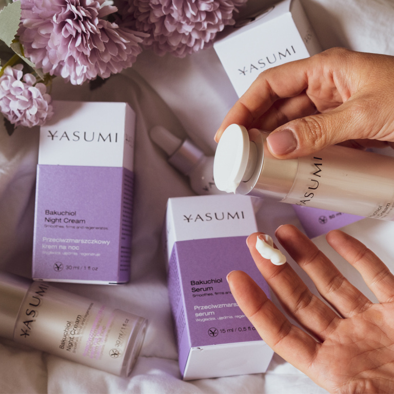 Bakuchiol, czyli bioretinol, to składnik pozyskiwany z rośliny Psoralea corylifolia. Działa lepiej niż retinol. Jest niezastąpiony w kosmetykach przeciwzmarszczkowych. Poprawia jędrność i stymuluje procesy regeneracyjne. Ma właściwości przeciwzapalne, gdyż hamuje namnażanie bakterii. W przeciwieństwie do retinolu nie wywołuje podrażnień, dlatego kosmetyki YASUMI Bakuchiol mogą stosować osoby z cerą wrażliwą, kobiety w ciąży i karmiące piersią.