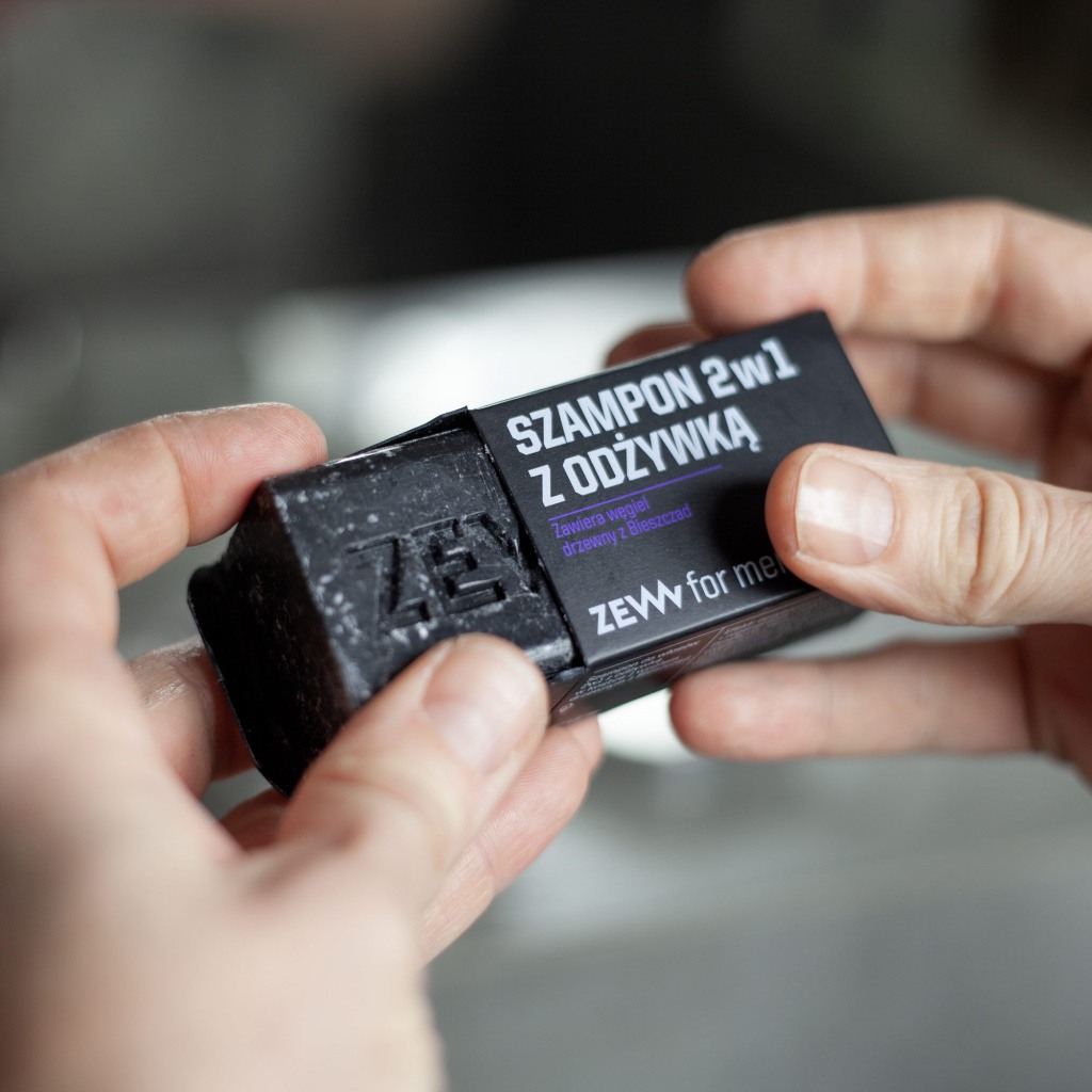 Poznaj nowość od ZEW for men – jedyny taki szampon do włosów 2w1 z odżywką w kostce, który spełnia wszystkie męskie potrzeby! Efekt? Dogłębne oczyszczenie skóry głowy plus regeneracja i odżywienie włosów. Nowy szampon z węglem drzewnym z Bieszczad o męskim, drzewno-piżmowym zapachu zapewnia zdrowy połysk, wygładzenie i sprężystość włosów, zapobiega ich wypadaniu oraz chroni przed uszkodzeniami. Zawarte w nim masła shea, kakaowe, z mango oraz olej kokosowy i oliwa z oliwek wzmacniają i nawilżają włosy, a także przeciwdziałają powstawaniu łupieżu i łagodzą podrażnienia skóry głowy. Naturalny, prosty skład, skoncentrowane składniki aktywne i widoczne efekty już po pierwszym użyciu – ZEW for men zna wymagania mężczyzn od podszewki!