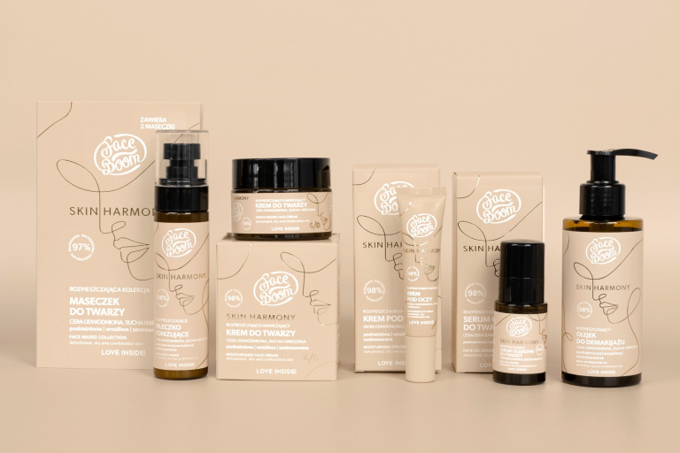 Linia Skin Harmony od FaceBoom to 6 kosmetyków do kompleksowej pielęgnacji cery odwodnionej, suchej i mieszanej z oznakami podrażnienia oraz zmęczenia. Seria przeznaczona jest do holistycznej pielęgnacji skóry i rozpieszczania zmysłów, aby poprawić nastrój i zapewnić równowagę oraz zdrowy wygląd.