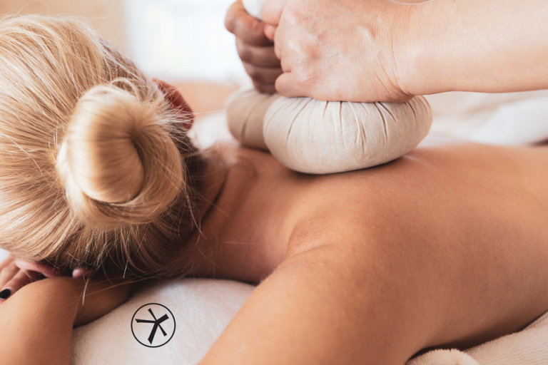 Close up of masseuse hands grab the warm herbal ball to press massage over the woman back for deeply therapy comforting and relaxing, Thai massage is the famous in Thailand for tourist.