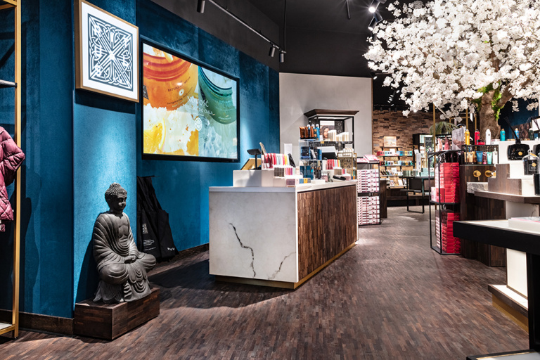 Wszystkie sklepy Rituals charakteryzuje pięknie zagospodarowana przestrzeń, która w wyjątkowy sposób oddaje klimat marki, pozwalając doświadczyć prawdziwego brand experience. Oprócz przemyślanej ekspozycji produktów, ułożonych zgodnie z kolorystyką kolekcji, w każdym sklepie znajdziemy drzewo Sakury, czyli japońskiej wiśni, stanowiące element charakterystyczny wystroju każdego sklepu Rituals na świecie. Klienci mają też okazję na chwilę relaksu przy water island, czyli pięknej kamiennej umywalce, gdzie specjalnie wyszkolona ekspedientka przeprowadza 3-etapowy masaż dłoni z wykorzystaniem kultowych kosmetyków Rituals.