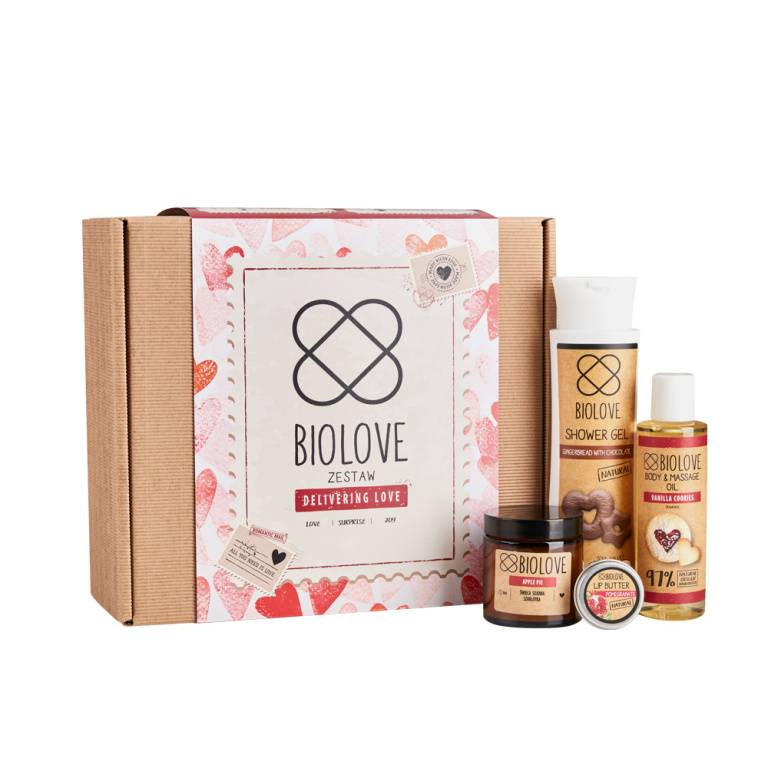 Delivering love to pomysł na prezent składający się z top produktów marki Biolove – wszystkie idealnie przekazujące atmosferę święta zakochanych. To propozycja skierowana do każdej kobiety niezależnie od wieku, która ceni naturalne składy i niepowtarzalne zapachy. Zestaw produktów Biolove, zamknięty jest w oryginalnym pudełku symbolizującym przesyłkę odebraną prosto z poczty miłosnej, którą w dodatku można spersonalizować, adresując do wybranej osoby. W zestawie oprócz starannie dobranych kosmetyków znajduje ciekawa podpowiedź spędzenia czasu z ważną osobą, czyli kupony na randki, które można zorganizować dzięki zawartym produktom, m.in. relaksujący masaż czy kąpiel przy świecach. W skład zestawu wchodzą: żel pod prysznic Piernik w czekoladzie, olejek do ciała i masażu o zapachu Waniliowych Ciasteczek, świeca sojowa Szarlotka i masełko do ust Granat.