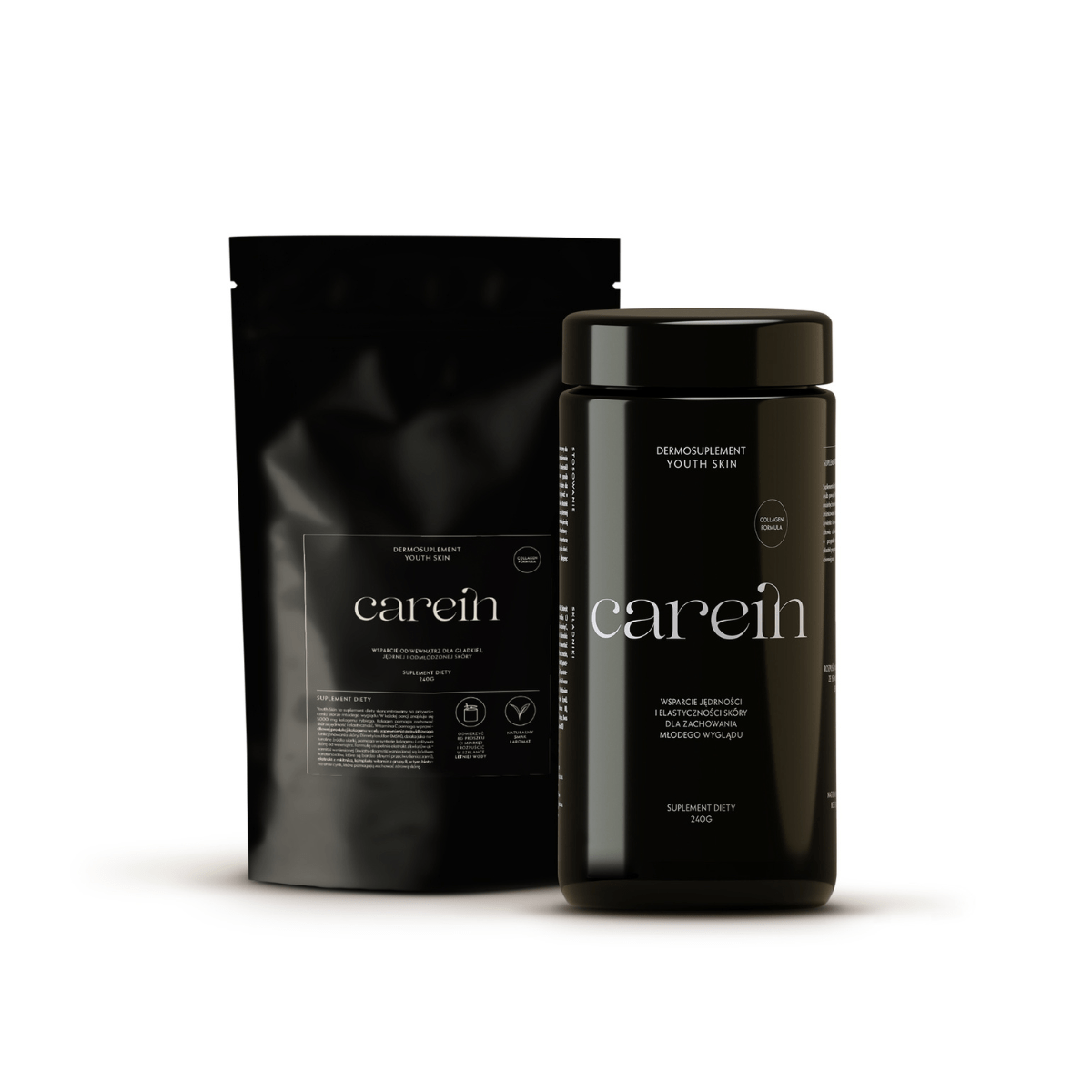 Dermosuplementy Carein zapakowane są w piękne, minimalistyczne, szklane opakowania wielokrotnego użytku, które następnie można uzupełnić refillem. Szkło fioletowe, zastosowane w opakowaniach Carein, ma unikalne właściwości odfiltrowujące szkodliwe promienie spektrum światła widzialnego, ale przepuszcza zabijające bakterie promienie UVA i UVB. Dzięki temu dermosuplementy możemy trzymać w widocznym miejscu na półce w kuchni czy sypialni, aby już nigdy nie pominąć codziennej dawki zdrowia dla skóry i całego organizmu.